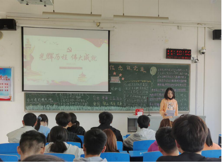 主题班会中,团支书用图文并茂的课件和精心挑选的视频,带领同学们学习回顾中国共产党的百年历程和伟大成就,追忆革命先烈,讲述英雄实际。随后,通过学习分享加深同学们对波澜壮阔的百年党史的认识和理解。主题班会在同学们的热烈讨论中圆满结束。